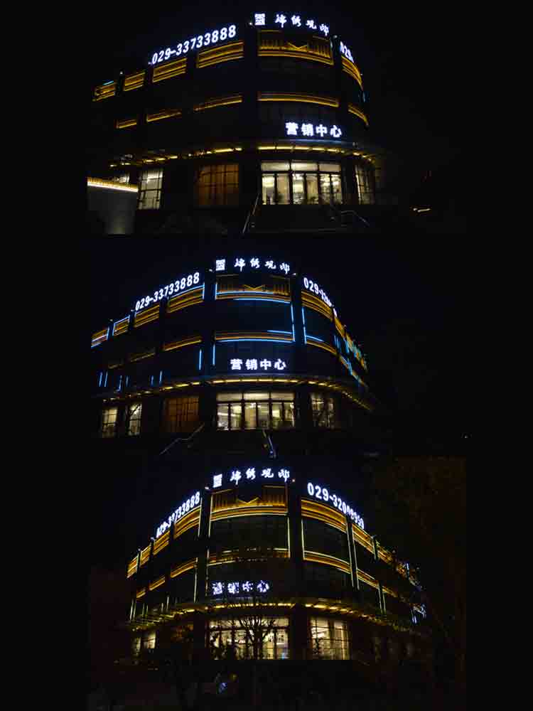 簡介—— 2018 榮盛景秀觀邸售樓部亮化,蘭光設計師根據其榮盛景秀觀邸售樓部商業屬性,商業照明設計明亮而醒目,營造商業經營的夜景氛圍。以靜態的暖色燈光將其打亮,凸顯雅致。“榮盛景秀觀邸”標志以高亮度的燈光,吸引顧客注意,增強商業宣傳力度。景觀燈造型與建筑外立面造型完美融合,晚上光斑效果與綠植景觀交相輝映,相映成趣!榮盛景秀觀邸
